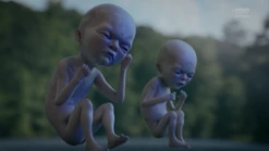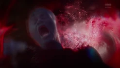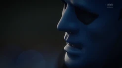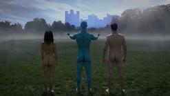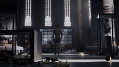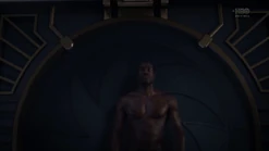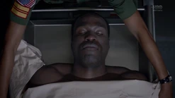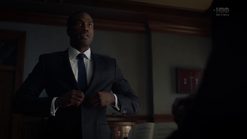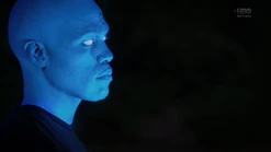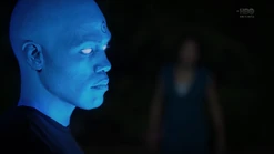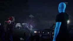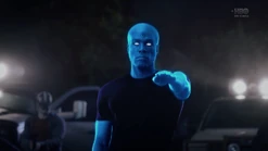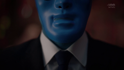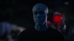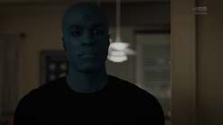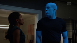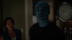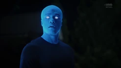 Two weeks later back in 2009, and Angela goes through the morgue checking bodies, finding three corpses that will be cremated because they have no one to claim them. She says that they have paper trails in the real world (i.e., birth certificates, passports, social security, etc.) and tells Dr. Manhattan to pick one. He suggests that she pick one unless she hasn't presented all of the options, and Angela pulls out the corpse of Calvin Jelani, who just dropped dead, and there's no family to pay for an autopsy, so his body will be cremated too and becomes ashes over Saigon. Angela admits that she's comfortable with him as her choice, and Dr. Manhattan proceeds to take Cal's form. In the process of Jon transforming to look like Cal, Angela notices that Jon sounds different. He tells her that his vocal cords loosened in the transformation, and he can change them back. But she says she likes how he sounds now. Angela then points out that he forgot to remove his symbol on his forehead. He says that he's going to forget so much more but that's a conversation for another time.