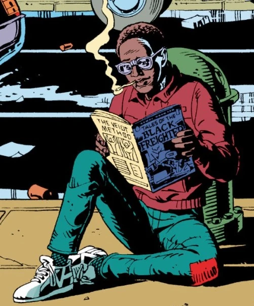 Bernie would hang out at Bernard's newsstand and sit beside the nearby spark hydrant to warm his back while reading an issue of Tales of the Black Freighter called "Marooned". He frequently goes back to the stand to continue the story.