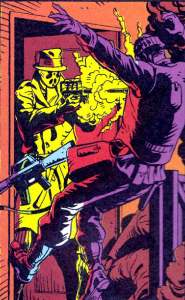 Charlie Greaves followed Rorschach to the third floor of Edgar Jacobi's apartment along with Officer Willis. Greaves said that he was like an animal and usually unarmed. Then Rorschach threw pepper to Willis blinding him, but Greaves couldn't shoot as he was in the way. Rorschach shot him at point-blank range with his gas-powered grappling hook gun while Willis called for him.[1] Greaves ended up with a shattered sternum and remained on the hospital's critical list.[2]