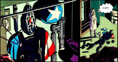 - According to Moore in a interview, he admitted that, in addition to being based on Peacemaker, also borrowed some aspects from Marvel characters like Nick Fury and Captain America. This can be seen in Blake's later patriotic costume and status as a World War 2 veteran (much like Captain America), as well as being an agent for the united states government and his scared face (similar to Nick Fury).