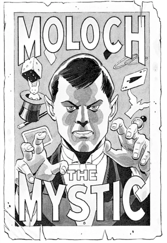 Jacobi became a vaudevillian and adopted the name Moloch the Mystic in sometime in the late 1930s. Moving from town to town, he performed three times a day, but even then, the money was not enough, as he had to pay any assistants he could find. He then resorted to bank robberies in order to feed himself and fund his state performances. Wanting to make a statement and use some style he wore a tuxedo and used his tricks to come and go. As he was making more money that way, he became a full-time criminal, and a boss of his own gang. His criminal actions often had him tangled with the Minutemen.