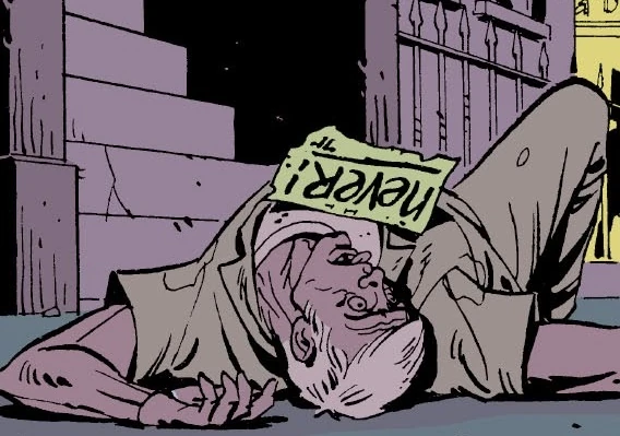 Following the passage of the Keene Act, Harvey Charles Furniss' dead body was found on the sidewalk outside a precinct of the New York City Police Department. Attached to the body was a note bearing Rorschach's emblematic signature and a single word, "neveR!" indicating Rorschach's refusal to comply with the Keene Act, which outlawed costumed vigilantes nationwide.[1][2]