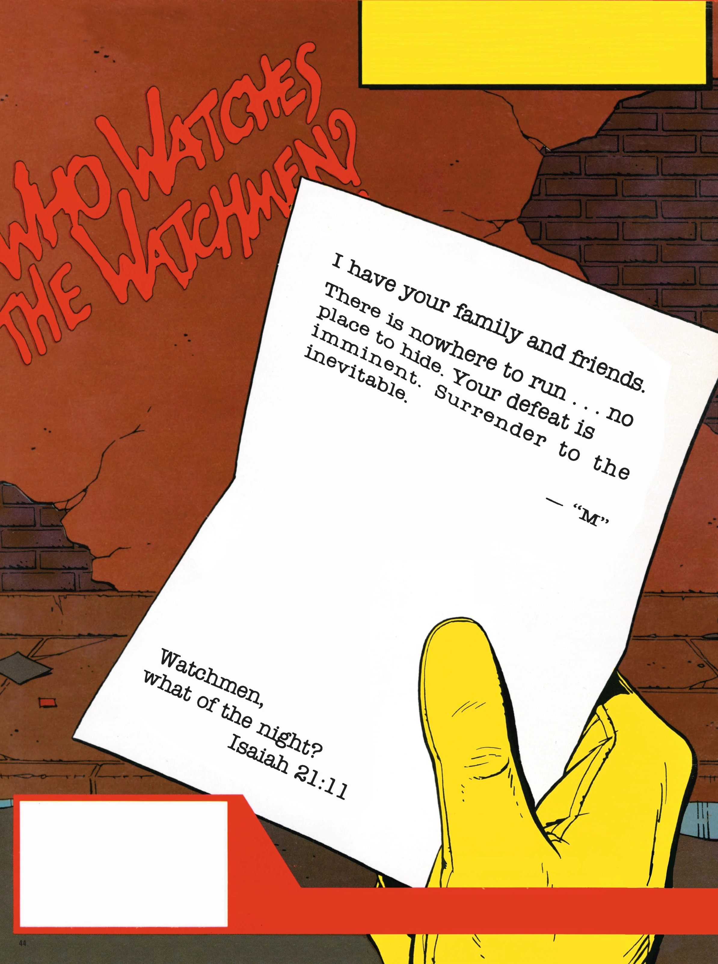 - ↑ Depending on whether a player wishes to be Jon Osterman, Jon may not be present. In that situation, Metropolis says 'I'm sorry to report that Dr. Manhattan cannot be with us. He said his lab work was keeping him too busy but he sends his regards and wishes us to bring this matter to a speedy conclusion.'