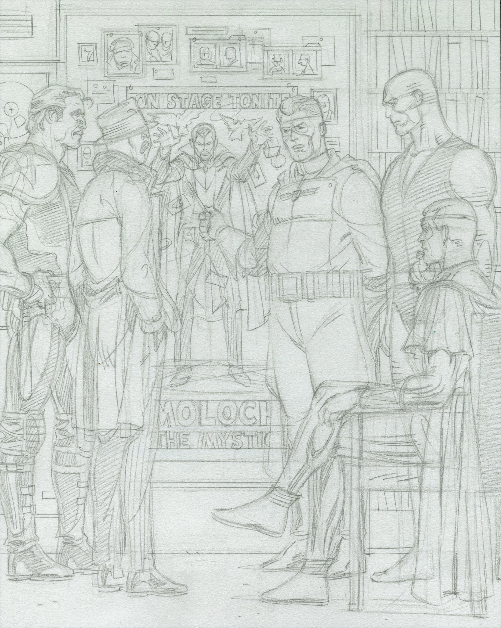 In 1966, after the unsuccessful meeting of Crimebusters, Captain Metropolis is still convinced the world needs a team of Costumed Adventurers. During his investigations into the crime lord Moloch the Mystic, he discovered that Moloch has been donating money to radical protests groups to fund their efforts, thereby diverting the Police Force away from his own actvity. Metropolis believes this is a grand conspiracy and sees how it could work to his favour. He devises a scheme in which he pays mercenaries to kidnap people close to members of the Crimebusters and then frame Moloch for these actions, believing that the Crimebusters will unite and stay together after solving this mystery. To do so, he contacts the mercs using a voice distorter and goes by the moniker 'M'. Metropolis has been trying to track down and convict Mole Varrows for drug traffiking, but instead decides it would be beneficial to use him as a middle man. He asks Varrows to hire youth gangs to do some of the kidnappings, and African-American gangs to kidnap Hollis Mason, Sally Jupiter and his mother. To kidnap Wally Weaver, Metropolis hires Milton Sabino. After Varrows successfully arranges the kidnappings, Metropolis shoots him, implicating Moloch in the process. Jeffrey Iddings, a boy Rorschach rescued from a kidnapping has been kidnapped, as well as Cindy Radway, an actress who hooked up with the Comedian and Ben Charles, a police chief who cooperated with Ozymandias. The Crimebusters meet in Metropolis' home and discuss the kidnappings.[note 1] They agree to begin an investigation. First, they look into the kidnapping of Hollis Mason, former Nite Owl and friend of Dan Dreiberg. Investigating the crime scene, they discover there were at least 2 kidnappers and one was wearing a leather jacket. Next they look into Wally Weaver, friend of Jon Osterman. Because Weaver was kidnapped from a military base, Lt. Colonel Howard Morgenstein is already conducting an investigation. They are allowed in and interview PFC Newton Ramsey. Ramsey tells them two men in a truck kidnapped Weaver forcibly. The Crimebusters infer that 'the wound on Ramsey's head,... is a superficial abrasion and not a club-wound,... it does not look severe enough to have caused unconsciousness.'. Ramsey insists he is telling telling the truth and Morgenstein is upset that they would harass one of his soldiers, not allowing the Crimebusters to conduct any further interviews.